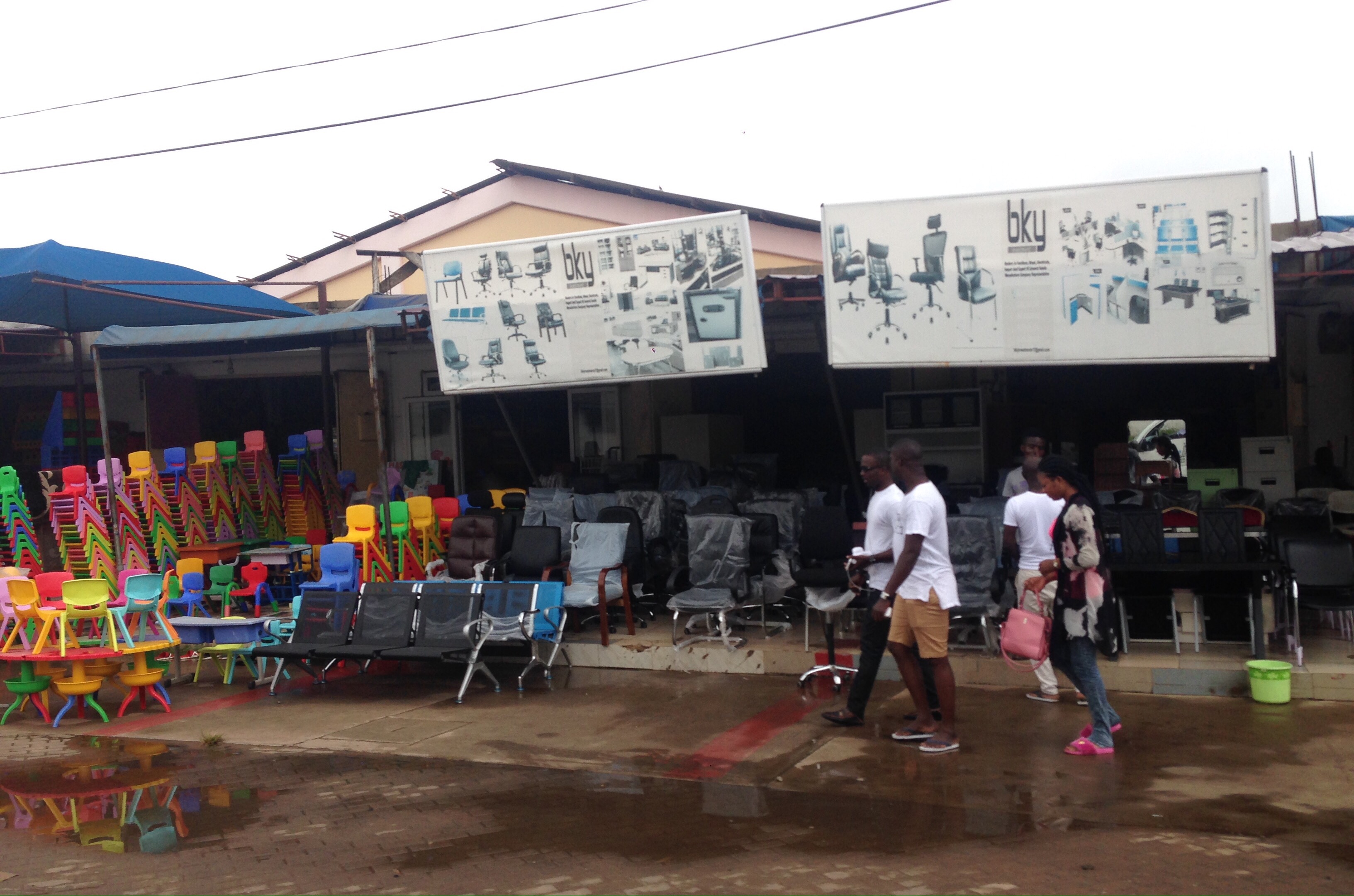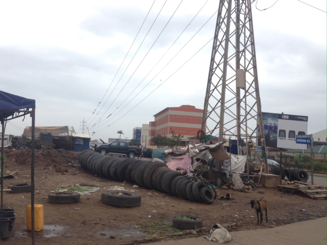 Below: industrial area around Raincoat factory in North West Accra. Trade and domestic activities accept spaces between the factoies’ compounds