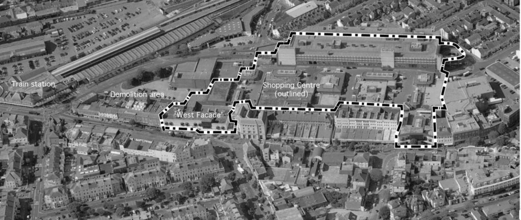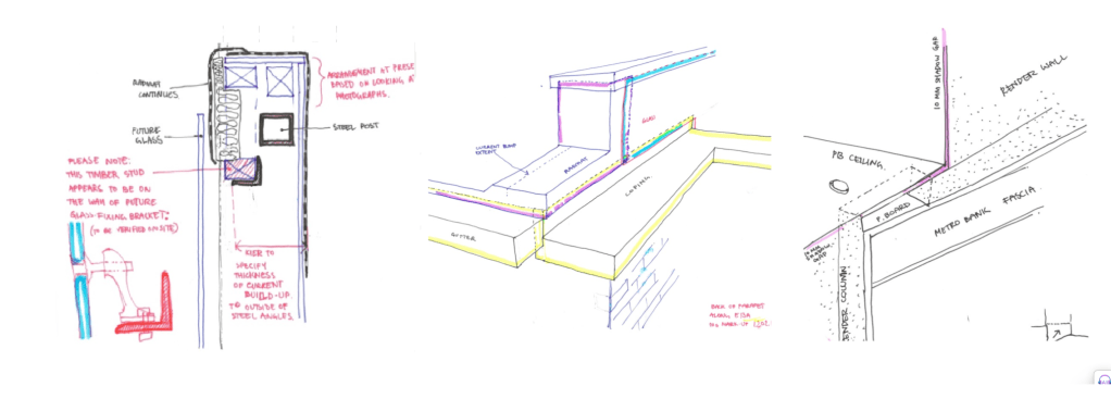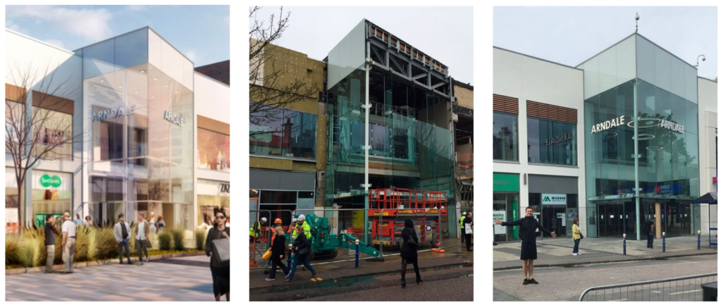 West Facade is a refurbished part of the shopping centre, sandwiched between its main existing part and the new extension, marked as demolition area on this mapResolution of various important details in the West Entrance was achieved through quick sketches, rather than formal drawings. In drawing these (some of my examples above), I was learning to balance between efficiency and ensuring critical elements are captured. One of the most rewarding aspects was to see how the visuals and drawings gradually turn into the real thing