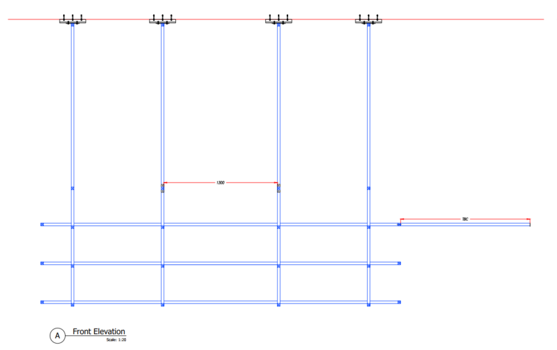 Another significant challenge was in designing the hanging shelving above the kitchen counter (pictured below). Given the convoluted arrangement of existing ceiling cervices, the shelf was pre-made in an adjustable way, with vertical support positions being determined on site post-delivery. Detail drawing below is by Salix, our metalwork supplier on this job