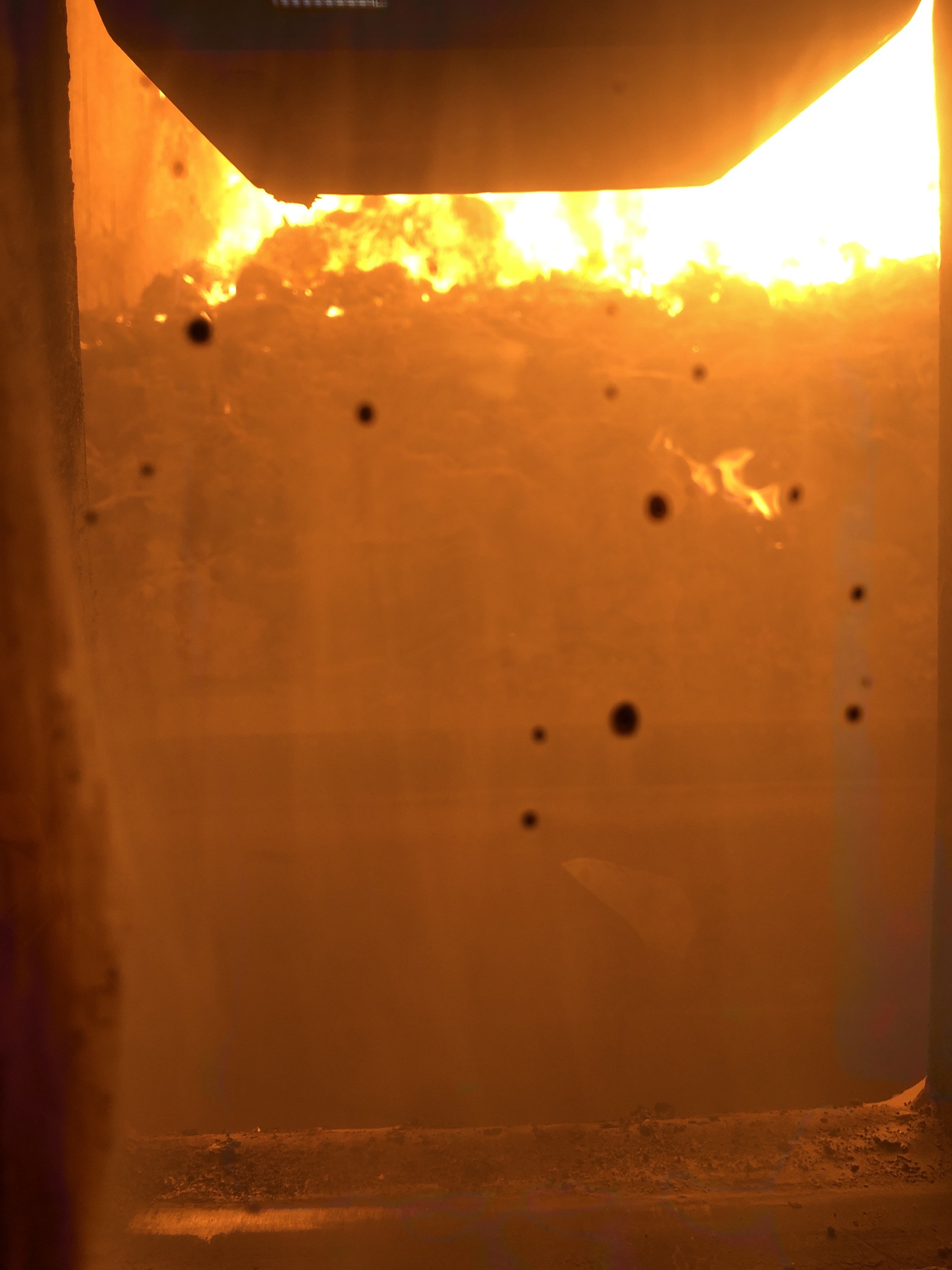 2 . Waste progresses along the incinerator grates, where most burning and heat occurs around the half way point. The line of the flame is well defined, unless there is an issue with the facility. Water pipes run throughout the incinerator walls. For a piece of waste it normally takes around 4 hours from being added onto the grates to coming from the other side in the form of ash.