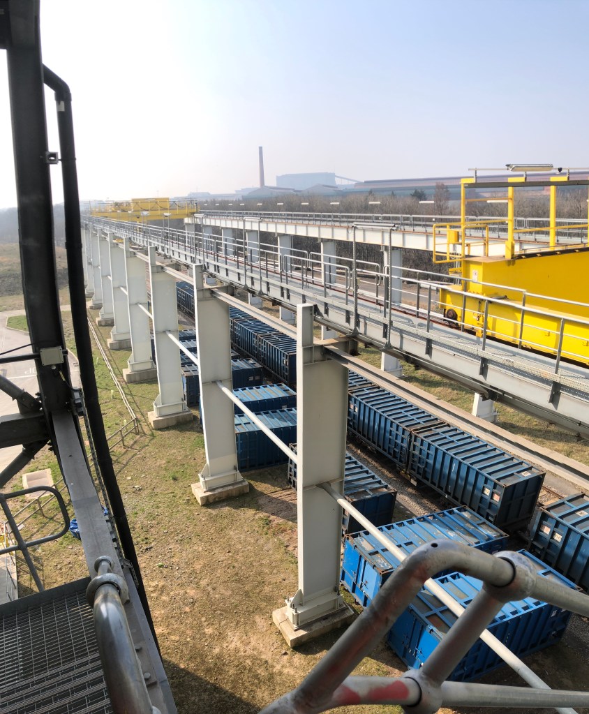 1 . The waste is brought into the large tipping hall. Trucks bring material to STV from Gateshead and Middlesbrough regions (some of it directly from households), whereas trains take it to Wilton from Merseyside (2000 tonnes a night). A grab loads approx. 1 t. the waste into the feeding chute. The staff member or an automated system operating the grab ensures there are no gaps between the chute edges the waste pile to prevent air and gases coming in and out of the system. Where waste does not undergo any pre-sorting prior to arriving, it creates a higher calorific value, i.e. produces more energy per tonne.