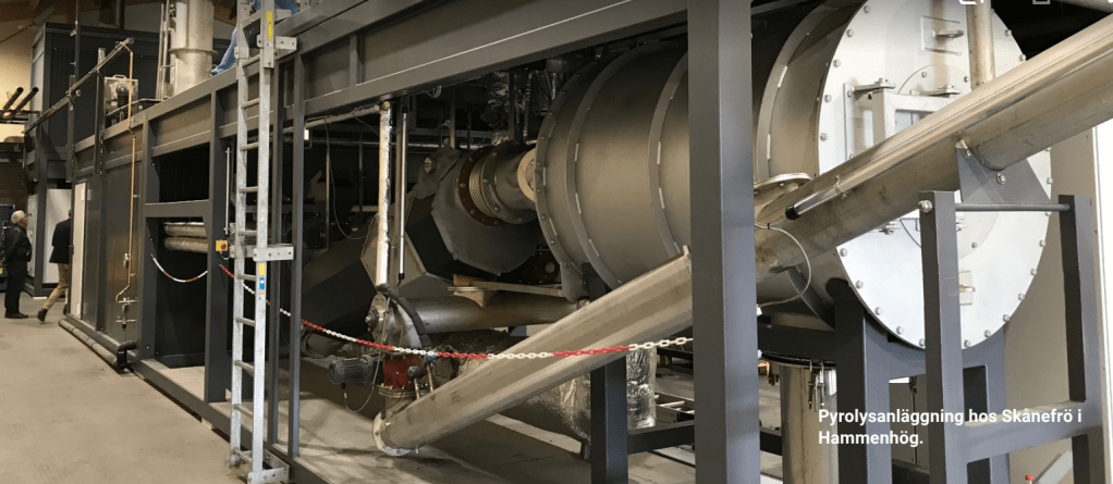 - Skånefrö has a number of facilities, medium-sized sheds with pyrolysis kit installed inside. The overall size of the plant can fit in a shipping container or two, as per the current scale of operation. Kit used by Skånefrö is made by Pyreg, however there are other manufacturers, such as Biomacon. The number and distribution of Skånefrö facilities was not made very clear.