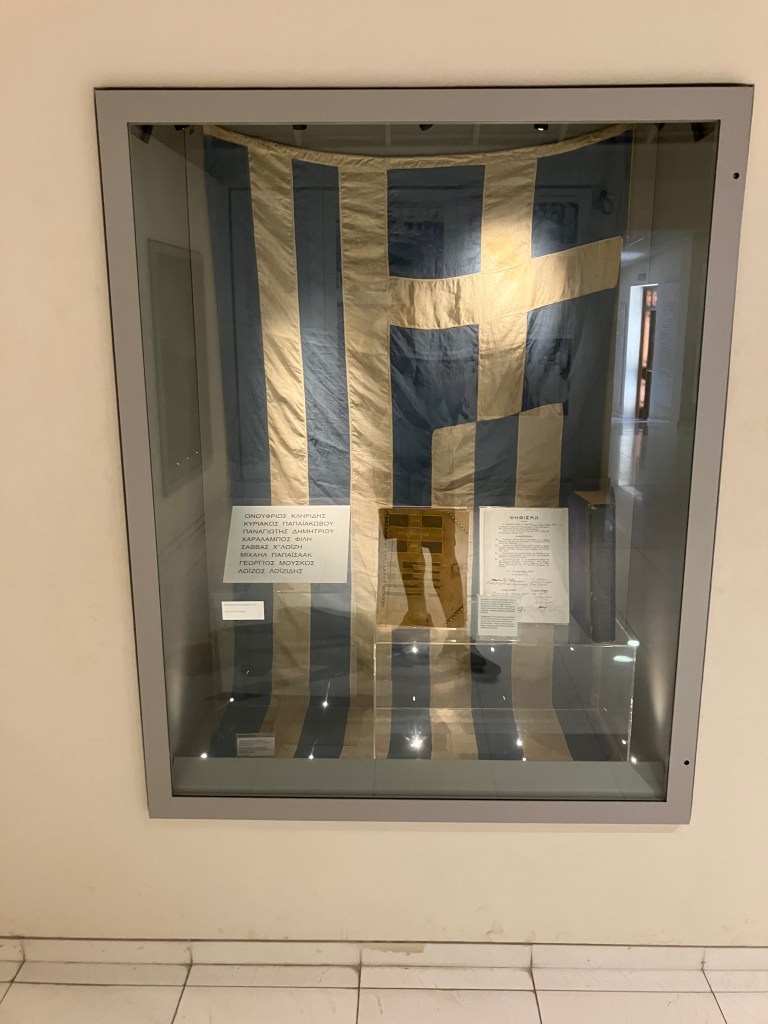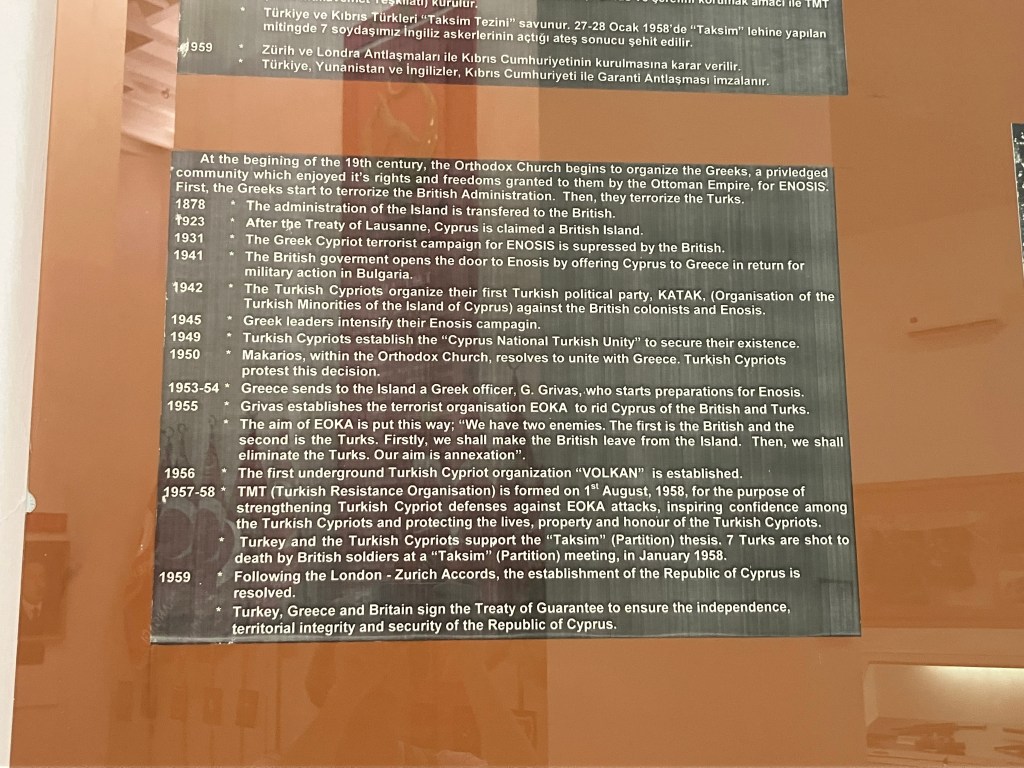 The displays of both National Struggles museums are vivid and provocative. Images are graphic and shocking, whereas information is organised around overarching National ideas of identity, injustice and rights to the island. The content appears to gravitate towards the respective side’s losses and presence in Cyprus, but does not refute the other side’s information. The Greek exposition majors on the results of the 1950’s referendum for Enosis (union with Greece), whilst the Turkish one prioritises a later agreement where the island’s division was agreed upon. Three centuries of Ottoman rule are seen as a period of stagnation on the Greek side yet a time of peaceful cohabitation on the Turkish side.