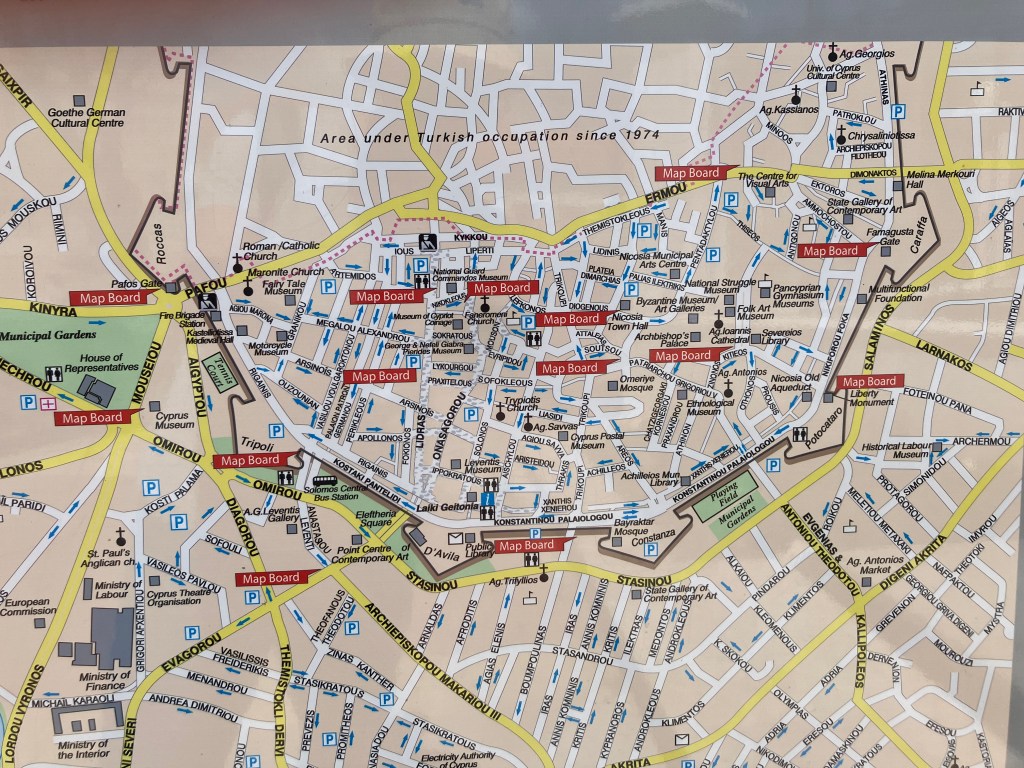 Nicosia is the capital of Cyprus, established thousands of years ago. The historic city is a fortification, shaped as a circle with 11 triangular bastions and a moat around, as built by the Venetians during the Renaissance. The city is divided in half with Greek Cypriots living to the south and Turkish Cypriots living to the north. A neutral zone, manned by the UN peace keeping forces, runs in the middle. Below are my reflections on a few of the important sites I visited, including stretches along the border walls and the National Struggles Museums on each side.