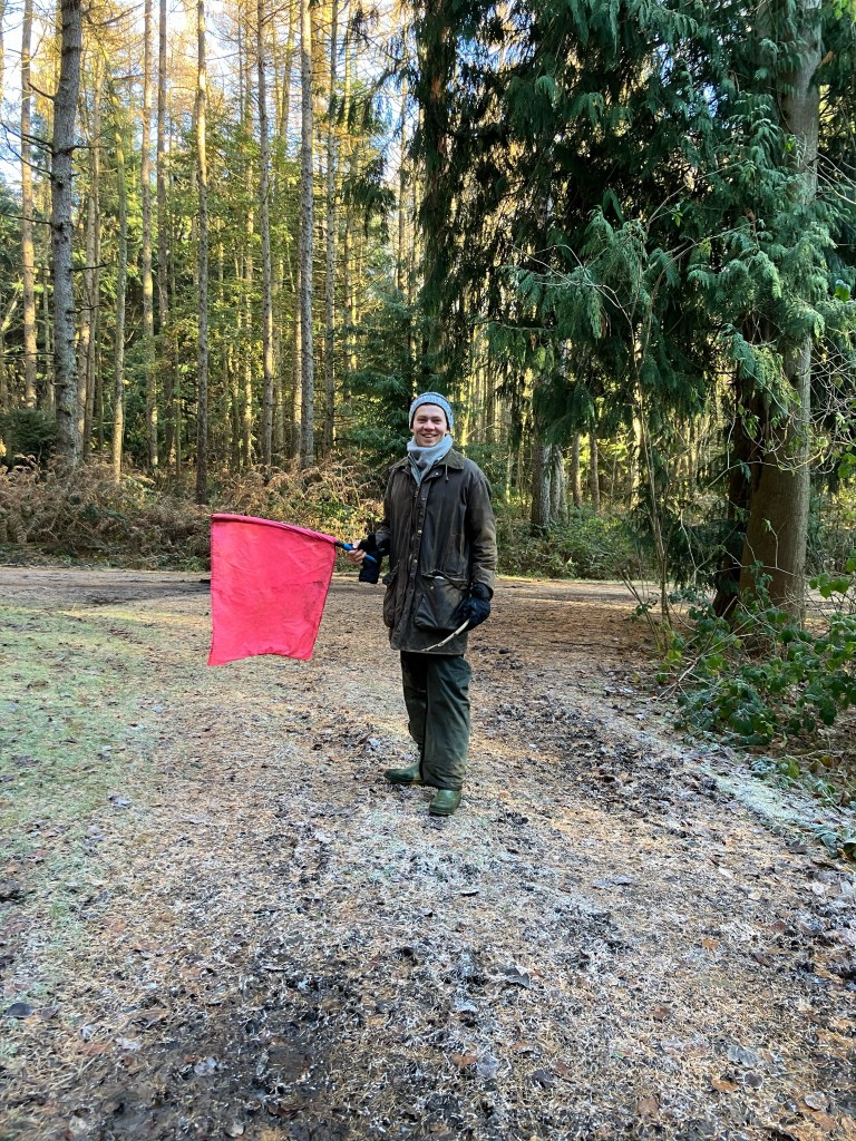 As beaters, we positioned ourselves along a line, led by the main beater, and made our way through the jungle of dense thorny Yorkshire vegetation. A flock of spaniels was constantly ahead of us, efficiently browsing through the most impenetrable bushes. We drove the pheasants up and down hills towards the guns positioned at the opposite end. Throughout our gradual progression through the weeds, bushes and puddles we waved flags, hit sticks and trees and made sounds, imitating the pheasants. There were 3 runs either side of the lunch break.