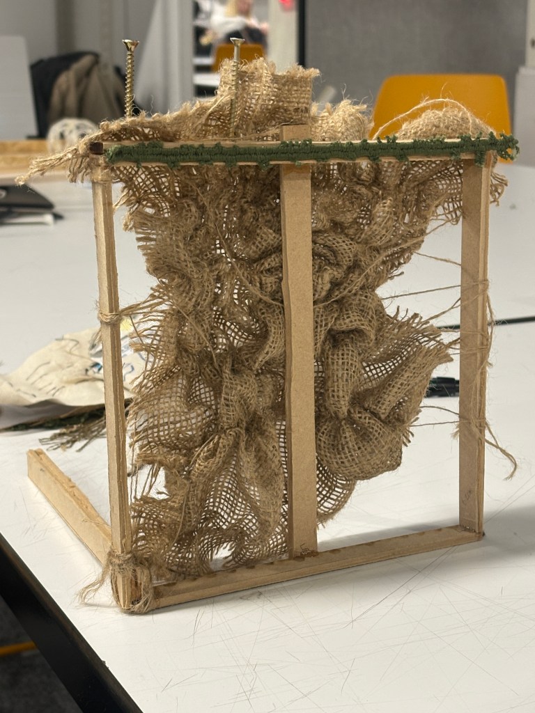 One project explored a ‘parasite’ approach with building skin glowing in the dark (pictured left). Although limited to working in a studio, rather than the workshop, students have been industrious in experimenting with a range of materials, including balloons, copper, bubble wrap, chipboard / mesh, plaster, fabric, pasta and noodles.